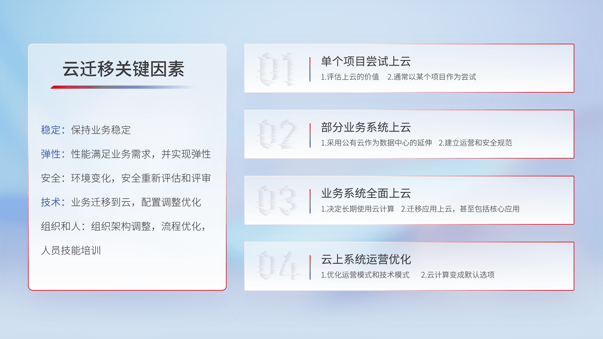 结合实际业务,,从规划设计、、、、云平台选型、、、、云原生改造、、、数据迁移、、集成交付,,,迁移全过程为客户识别最佳上云路径,,做好风险识别管理,,,,设计网络架构、、、、身份权限、、、安全审计合规、、、、操作审计、、日志审计、、监控告警策略、、、多站点容灾设计等,,,,对云上基础设施进行整体规划,,,,提升IT治理水平,,以满足弹性、、、高可用、、、、高性能的需求。。。
