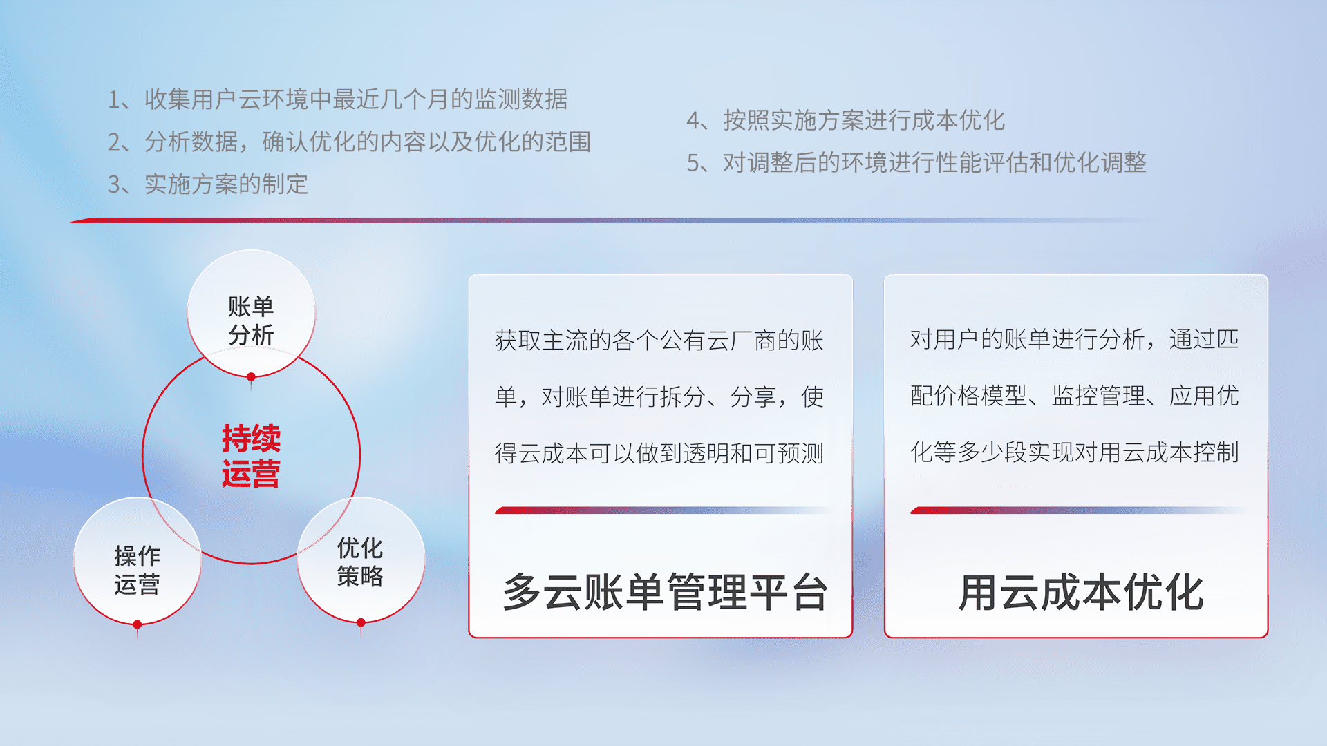 通过多云纳管,,,以统一的资源数据模型把客户的云资源进行抽象和封装,,,,进而实现对多云资源的统一操作,,保障云资源管理的可靠性、、稳定性与可用性。。量身定制化运维内容,,,,配置、、、开发运维、、、、补丁管理、、、、备份、、、监控、、认证和访问管理、、审计和日常巡检等,,,保障在用云过程中的可靠度,,稳定度以及高可用率。。