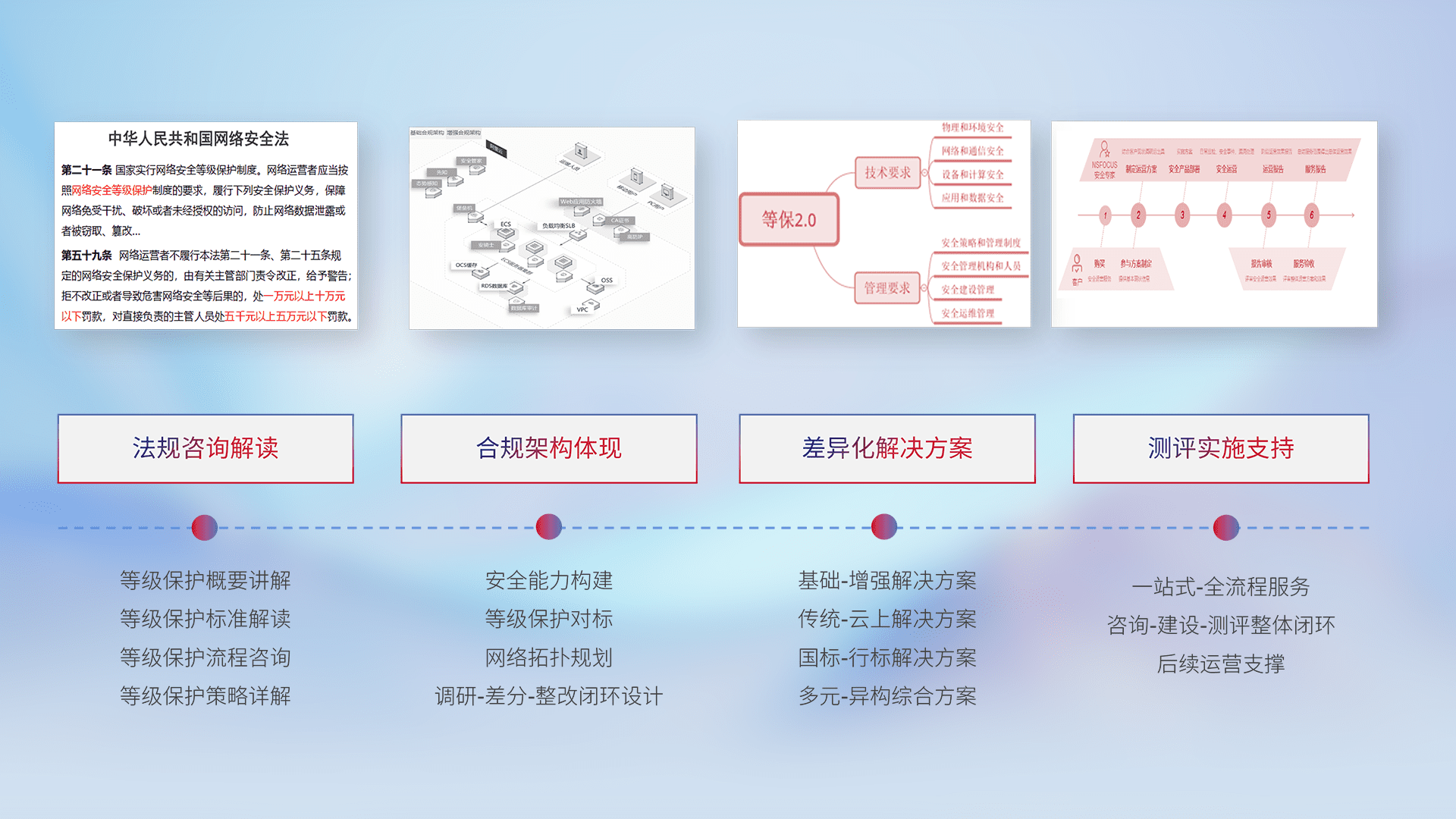 通过专业的法律咨询解读、、、、合规架构体现、、、差异化解决方案、、、测试实施支持等服务,,为客户量身打造等保合规体系。。。。
